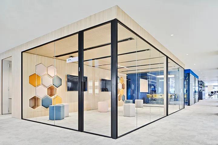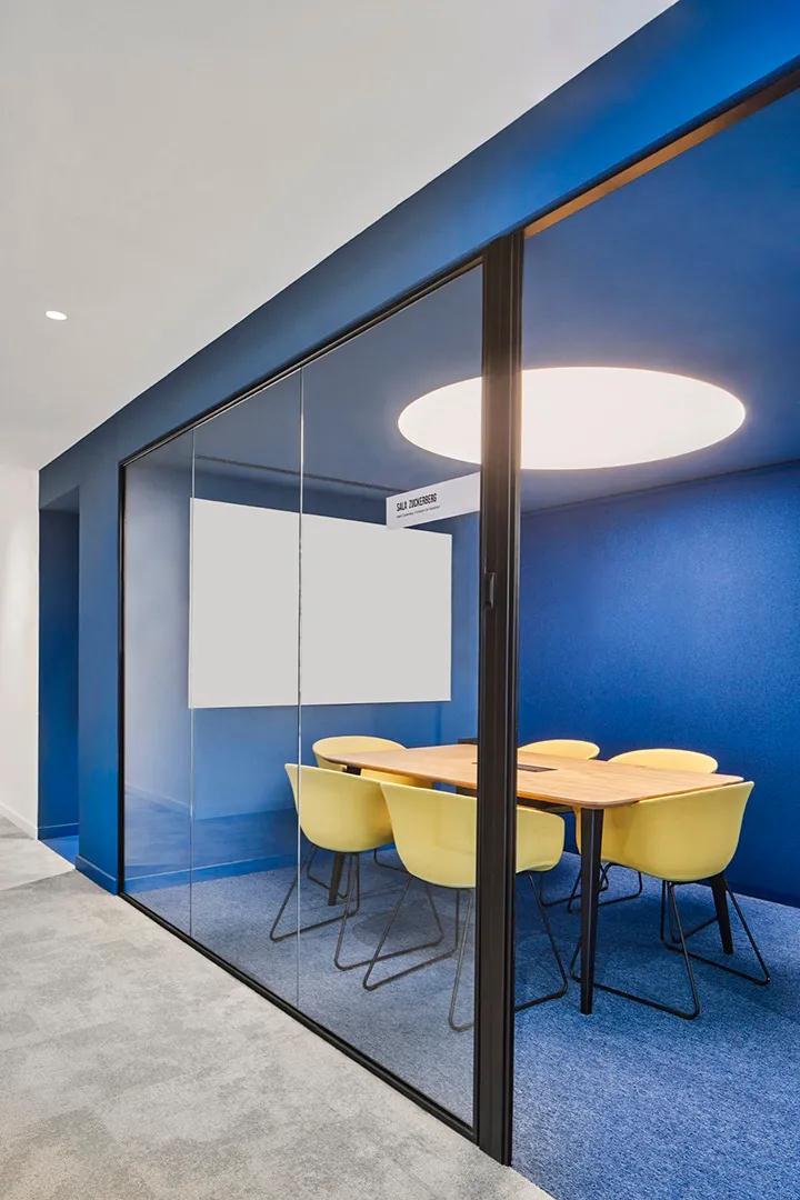 淺色人行道,淺色開放工作區和淺色木飾面均與空間的藍色空間形成鮮明對比。沒有牢固的隔斷墻,功能空間就通過色彩的創造得到清晰而有力的界定,創造出精致,簡單和高度個性化的時尚辦公環境。
