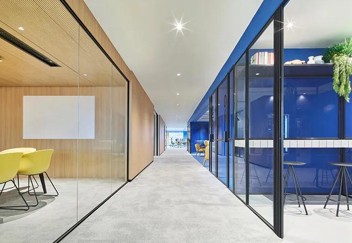 該項目位于西班牙巴塞羅那的dau大樓的六樓,主要用于西班牙金融服務公司的創新和營銷部門。該案例是由深圳裝飾公司的設計團隊創建的。內部顏色主要是藍色和黃色,來自公司的圖像徽標,在這種情況下,最終實現了該空間的驚人視覺效果。藍色調的色彩表達,深圳裝飾公司在會議室和休息區的墻壁,頂面和地板上呈現了最極端的方法,由色彩形成了高度獨立的空間。