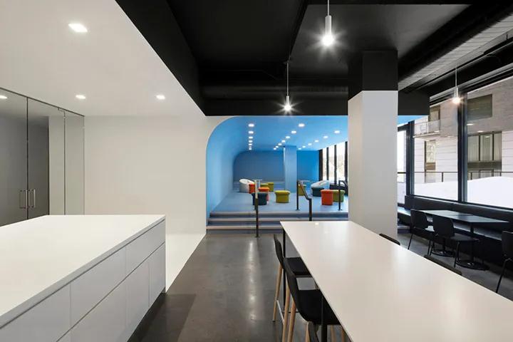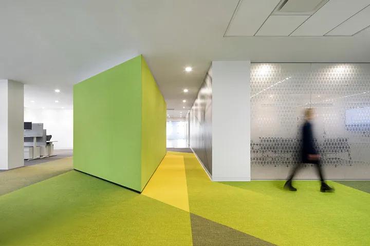 建筑體積為整個空間帶來了強烈的運動,而輔助色則增強并定義了每個工作區(qū)域。為了將安靜的工作區(qū)域與公共區(qū)域區(qū)分開來,設(shè)計團(tuán)隊使用透明玻璃(有時是半透明的薄膜)來分隔空間,同時保持整體的開放感。