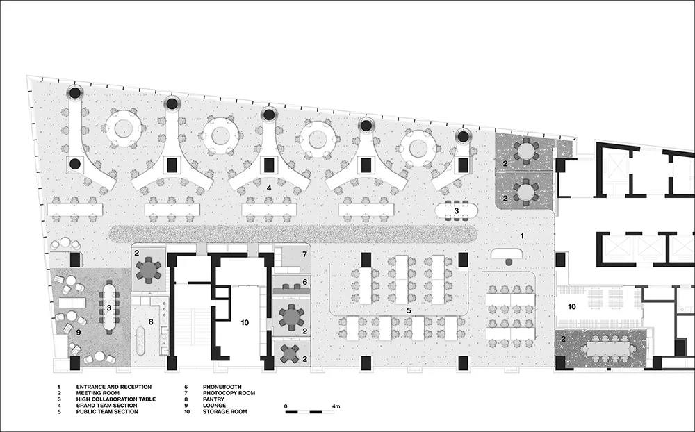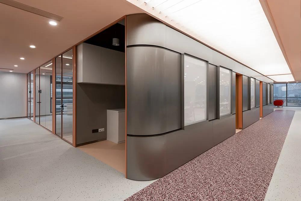 打造全新的辦公裝修空間。雙方合作設(shè)計(jì),傳遞前沿時(shí)尚態(tài)度,定義未來科技驅(qū)動(dòng)的辦公方式,整體設(shè)計(jì)是一個(gè)線性空間,三邊由高玻璃隔開包裹。深圳裝飾公司形成了秩序井然、合作便捷的辦公氛圍。設(shè)計(jì)試圖在一系列弧度和曲面的表現(xiàn)與工業(yè)風(fēng)格的硬朗質(zhì)感之間創(chuàng)造一種平衡感。中央走道的設(shè)計(jì)實(shí)現(xiàn)了迎賓和引導(dǎo)視線沿空間延伸的雙重功能。天花板是長條形拉伸膜光幕,外部裝飾有一層玻璃網(wǎng)格,與深紅色橢圓形乙烯基底座裝飾相反。深圳裝飾公司拉絲不銹鋼墻板外嵌有滑動(dòng)白板和留言板,方便辦公室裝修設(shè)計(jì)過程中的合作。靠近入口的三間會(huì)客室和前臺(tái)均采用漸變長虹玻璃,顏色由粉色過渡到透明。會(huì)議室的墻壁是柔和的粉紅色,深圳裝飾公司嵌入了不對(duì)稱裝飾板,天花板是橢圓形透明膜,地面是深藍(lán)色的德嘉地板。接待區(qū)和辦公區(qū)由弧形黑框不銹鋼穿孔板屏風(fēng)隔開。屏幕鏤空?qǐng)D案的大小由下至上逐漸設(shè)計(jì),既保護(hù)隱私又保證視野內(nèi)的廣闊視野,空間四周環(huán)繞著會(huì)議室、印刷室、茶室和一些安靜的角落,周圍環(huán)繞著珊瑚色的金屬屏風(fēng)。深圳裝飾公司上述空間的內(nèi)部和天花板也延續(xù)了屏幕元素,與裸露的混凝土天花板形成對(duì)比。茶室里有一個(gè)由卡拉白大理石制成的波浪島。休息室的地板是軟木地板,擺放著一張質(zhì)感很強(qiáng)的定制大理石長桌。衛(wèi)生間的家具都是人造家具。空間內(nèi)規(guī)劃了可容納100人以上的培訓(xùn)室、直播室、會(huì)議室等多個(gè)功能空間。墻壁設(shè)計(jì)不同:有些是木條,有些是波浪形布?jí)Π濉?/span>